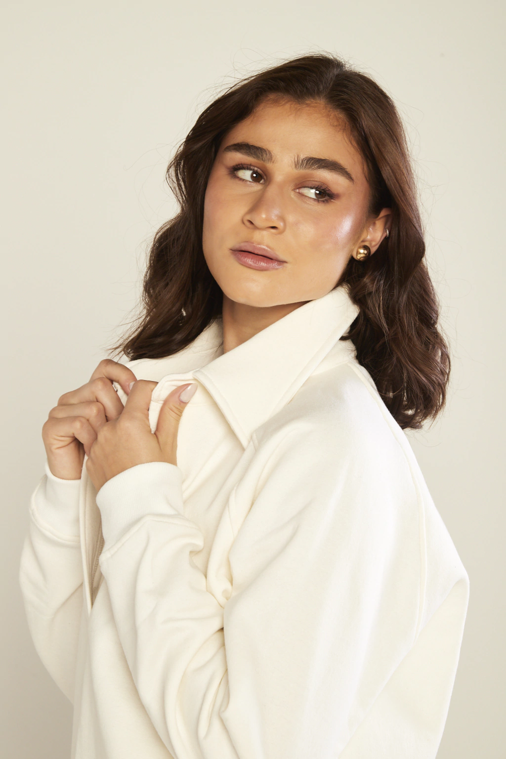 Esse casaco possui comprimento padrão, manga longa e decote em modelo "Polo" com gola.