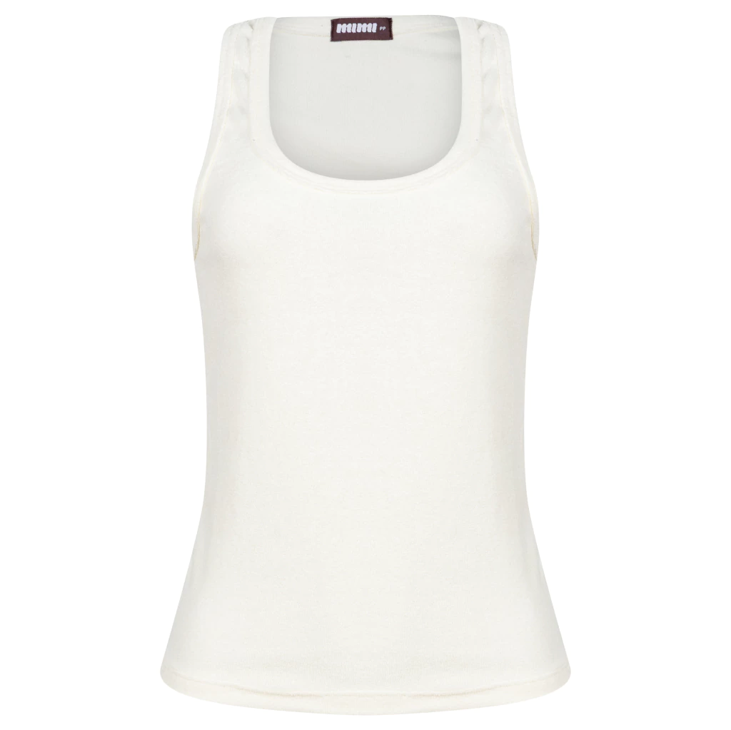 Regata com comprimento normal, caimento justo, sem mangas e decote padrão.